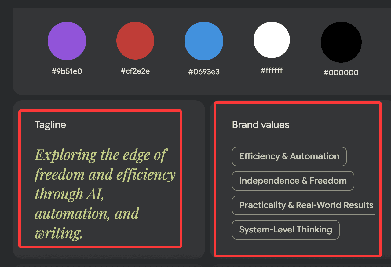 my brand colors, tagline, core values, and even a description of my brand voice.