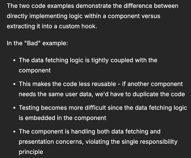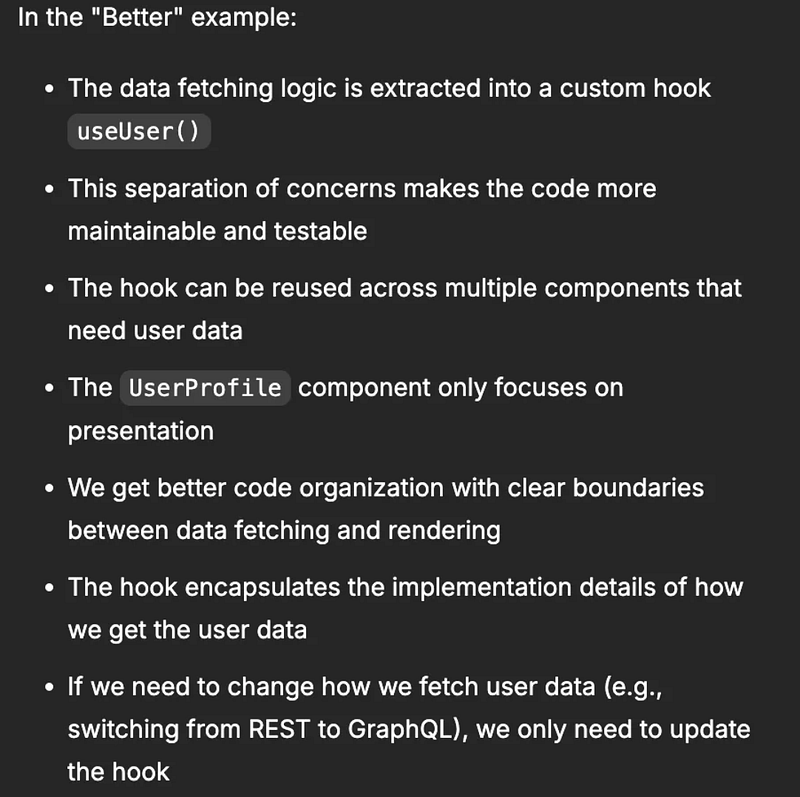 The “better” version separates concerns properly. It extracts the user data-fetching logic into its own custom hook, and keeps the UI rendering logic within the component. Each function now does one thing and does it well.