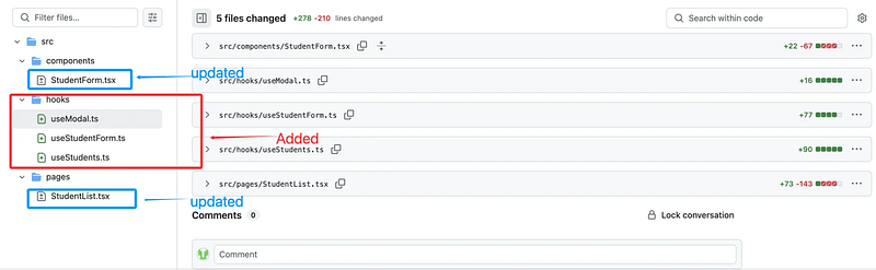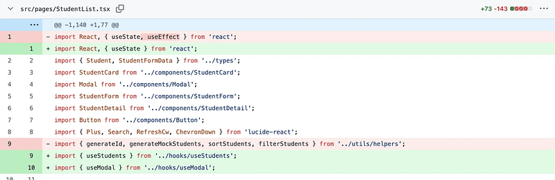useModal.ts,useStudents.ts,useStudentForm.ts - Improved modularity, testability, and clarity
